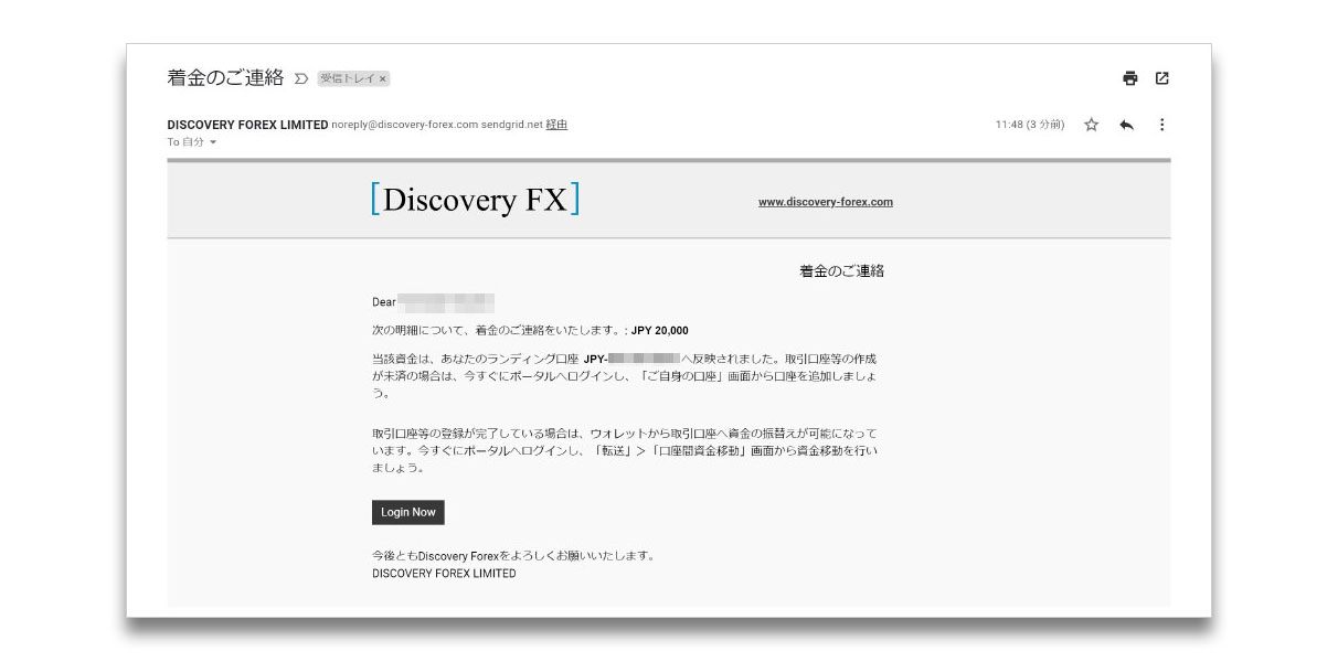 クレジットカード会社の認証完了ページが表示された後、しばらくするとDiscovery FXページに戻り、上記の画面が表示されます。