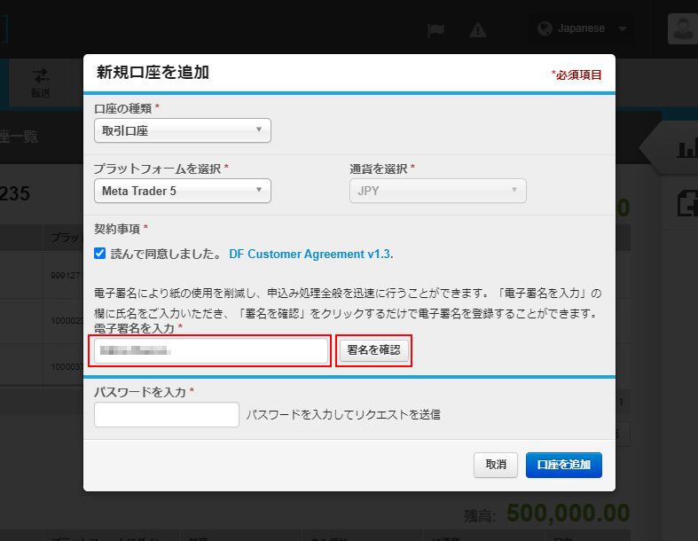 ウォレット口座に対応したメタトレーダー5口座を追加できます。