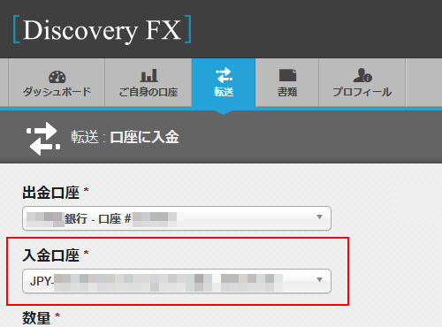 ・「4.Discovery FXの入金口座を設定」で指定した口座に連動して入力欄の後ろに通貨単位が表示されます。